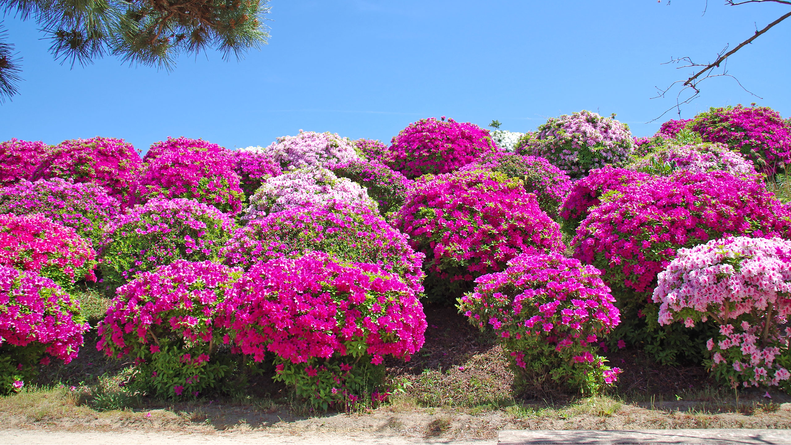 観音寺市総合運動公園内にある三谷池のえん堤で、赤や白、ピンクの色鮮やかなツツジを見る事ができます。三谷池えん堤には大型の品種として知られるヒラドツツジが約440株植えられており、例年4月の中頃から見ごろを迎えます。