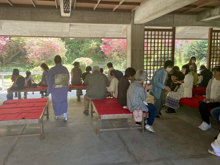 観音寺市の代表的な観光名所である「銭形砂絵」の春季砂ざらえに合わせて、水琴窟やヤマツツジのある琴弾公園浴日館休憩所でお抹茶の接待を行います。砂ざらえに参加される方や一般観光客の方々を対象に、新緑に囲まれて一服のお茶とお茶菓子のお接待で憩いのひと時を過ごしていただきます。