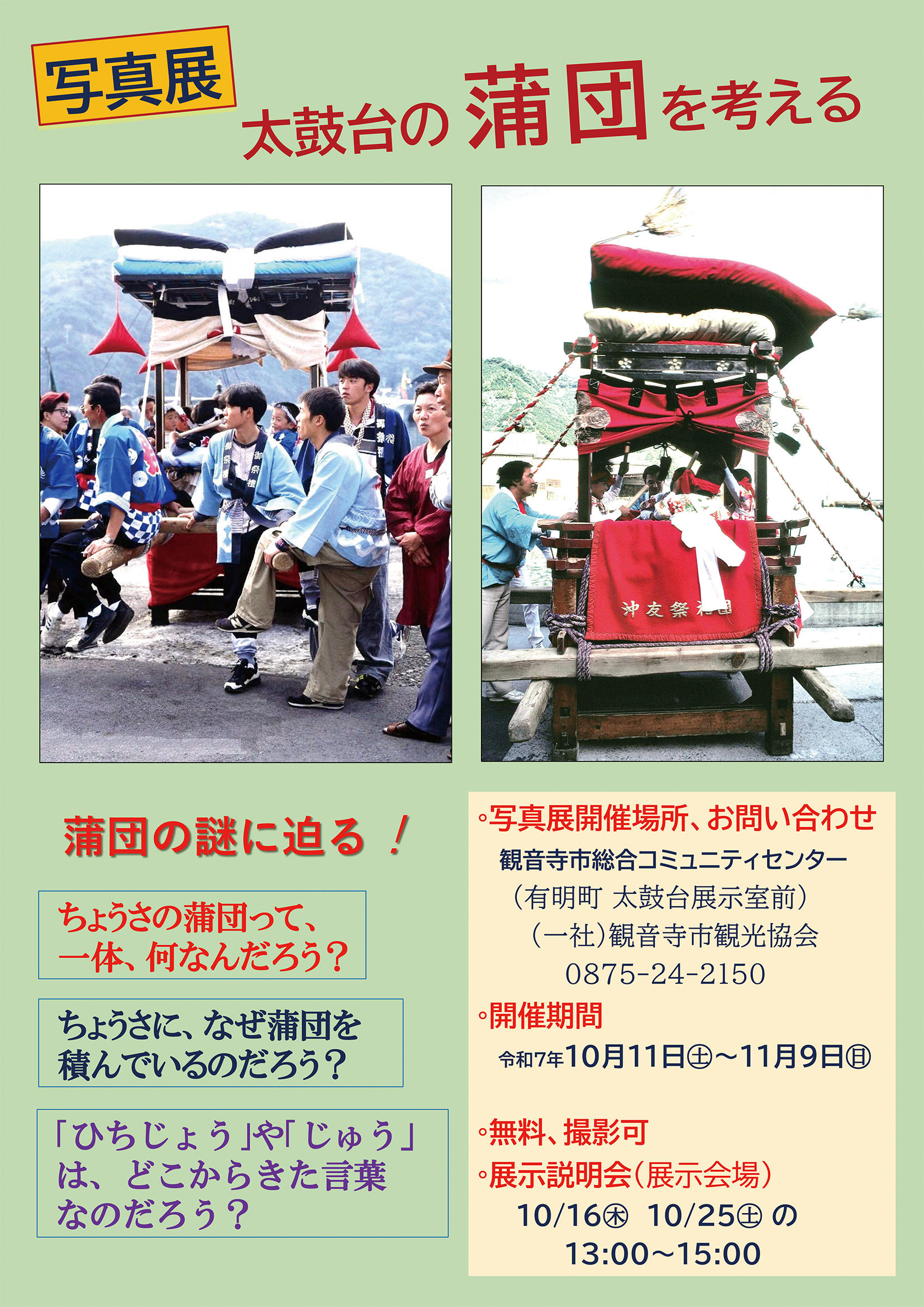 蒲団型太鼓台の過去(草創期や発展期)は、いったいどのようであったのだろうか。今に至る蒲団型太鼓台の、流行の大元は何であったのだろうか。本展を通じ、様々な謎についてご一緒に考えたいと思います。(観音寺太鼓台研究グループ 尾崎明男氏)