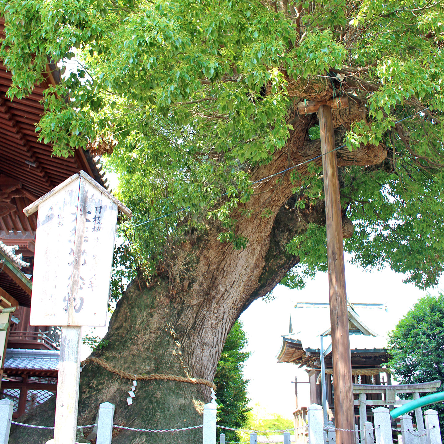 日枝(ひえ)神社は、柞田が日吉社領となった際にその神霊を山王権現(さんのうごんげん)としてお迎えした神社といわれています。山王権現とは、日枝山(比叡山)の山岳信仰、神道、天台宗が融合して成立した延暦寺の鎮守神です。境内には、香川県の天然記念物にも指定されている大クスがあり、幹囲は地上1.5mの所で7.7m、樹高40m枝は、東西30m、南北33mに拡がっています。クスノキは拝殿の屋根を覆い、根は地上から上がって曲がりくねり、注連縄を張り巡らした幹に歴史を感じる事ができます。また、秋季例大祭には柞田地区のちょうさが最大数、日枝神社に奉納されます。