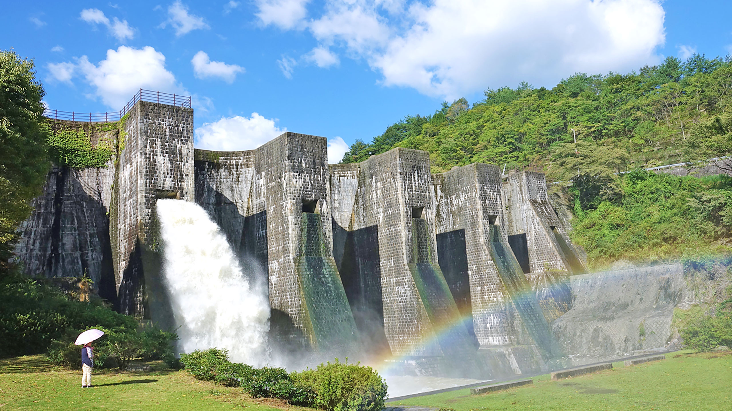 豊稔池堰堤(ほうねんいけえんてい)は、阿讃山脈を分け入る柞田川上流に築造された、堤長145m、堤高30m、中央部に5個のアーチと6個の扶壁を持つマルチプル・アーチダム。長い年月の風雨にさらされたダムは、中世ヨーロッパの古城を思わせ、訪れた人々に威容と風格を感じさせます。貯水量159万3千トンの能力を持ち、市内の田畑を潤す、まさに市内の水がめのような存在です。平成18年12月19日、重要文化財に指定されました。