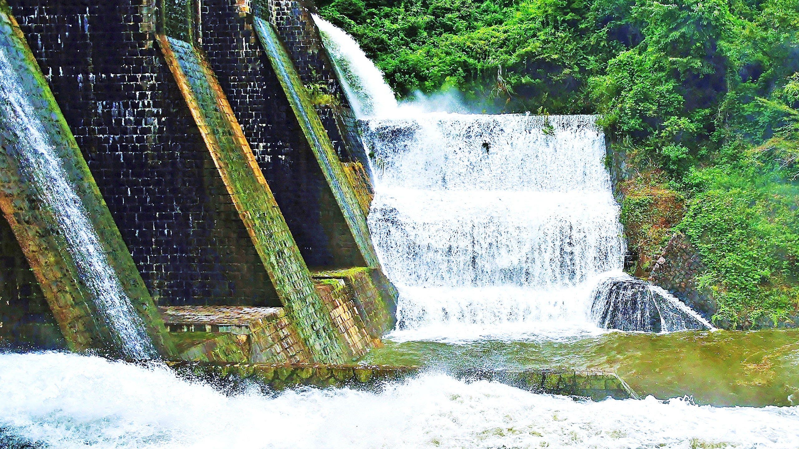 豊稔池のゆる抜きは、毎年夏に行われます。下流にある井関池の貯水量が3割を切ったころを目安に行われる季節の風物詩として知られており、ごう音とともに毎秒4トンもの水が放流される景色は壮観で見応えがあります。「ゆる抜き」は、池のゆる(取水栓)を抜く行事で、田植えが終わるまでの1週間、水田に水を供給するのが目的です。ゆる抜きの後は、雨量、貯水量を鑑みて、配水量を調節が行なわれています。