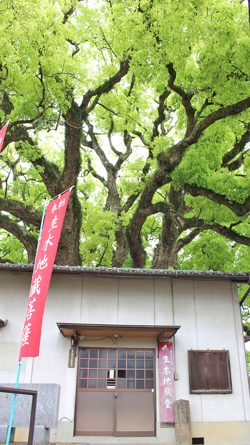 生木地蔵尊(いききじぞうそん)は、樹齢1200年と推定され、胸高周囲10m、樹高30mの大楠。この樹体内に身長150cm(五尺)の地蔵尊があり、近隣の人々から 「生木の地蔵さん」 と呼ばれ崇拝されています。当時の住人森安利左衛門豊秀が、天保7年に一人娘の病弱を案じ掘り上げたもので、「生木の地蔵さん」に願い事をすれば何でもかなうと言われているパワースポットです。最近では、県外からも数多くの参拝者が訪れています。生木地蔵と大楠は、昭和51年6月に指定観音寺市指定文化財(天然記念物)にも指定されています。
