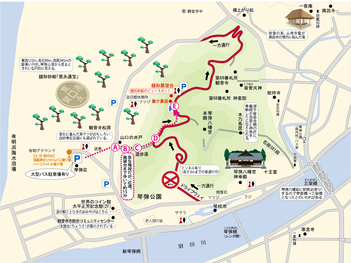 展望台から銭形砂絵をご覧になりたい方は、山口の井戸横の「遊歩道」をご利用ください。 遊歩道から展望台へ上がることができます(片道約15分)。 (※急な階段になりますので、階段を上がることに支障がない方)