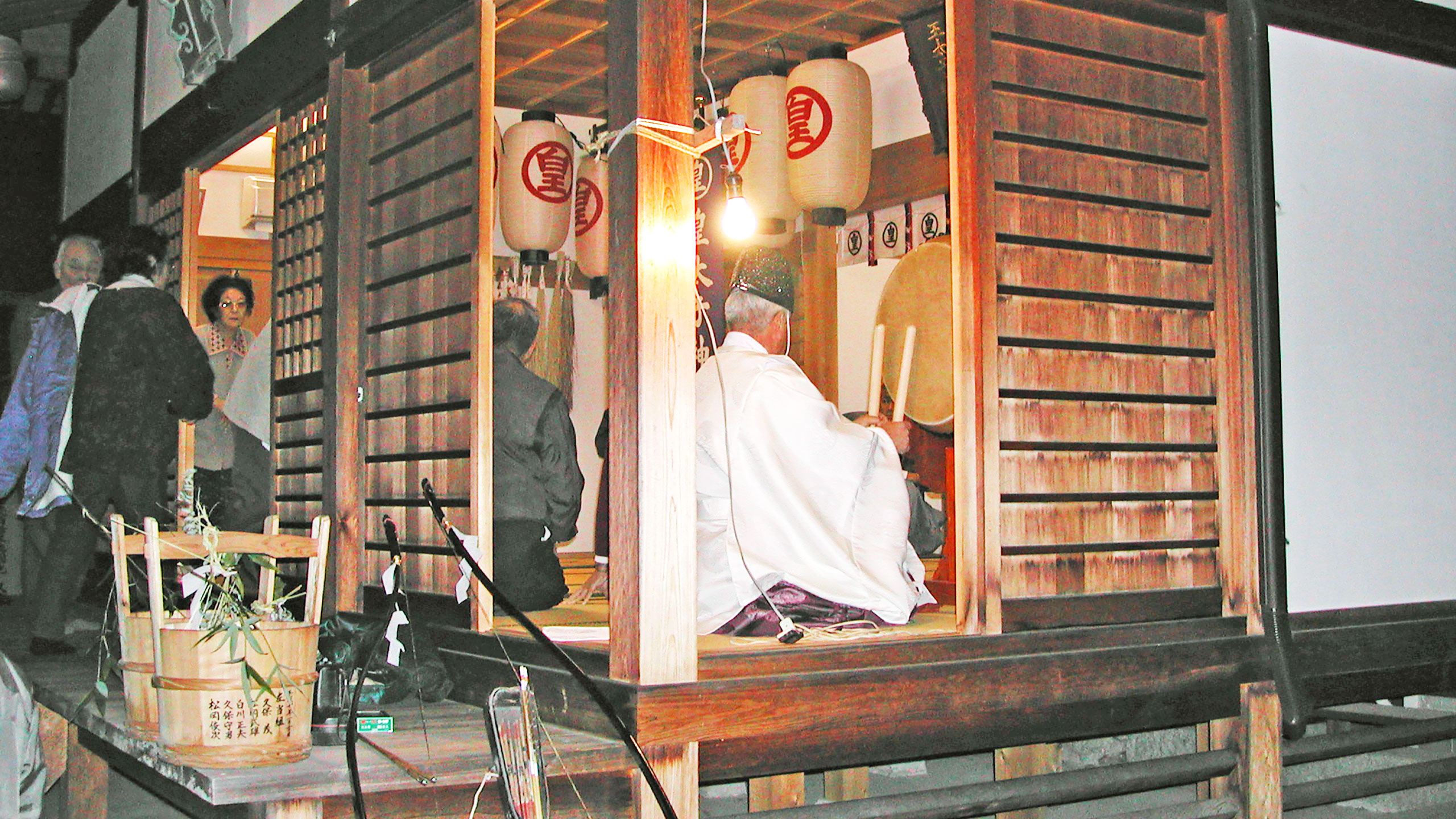 御門弓(おかどゆみ)は、毎年1月7日に観音寺市室本町の皇太子(おうたいし)神社で一年間の豊作を占う弓を射る神事です。言い伝えによると室本浜に麹の神が漂着した際に、それをまつったのが始まりと言われています。御門弓は、麹の神の右側を担いだものと左側を担いだものの子孫が現在も左右の溝に分かれ神事を行っています。当日は、講中(講を作って神仏にもうでたり、祭りに参加したりする信仰者の集まり)が家紋入りの提灯を持って着座し、太夫を唱え的に向かって矢を放ちます。平成15年3月20日に市指定無形民俗文化財に指定されています。保存団体は御門弓なぬかびさん保存会です。