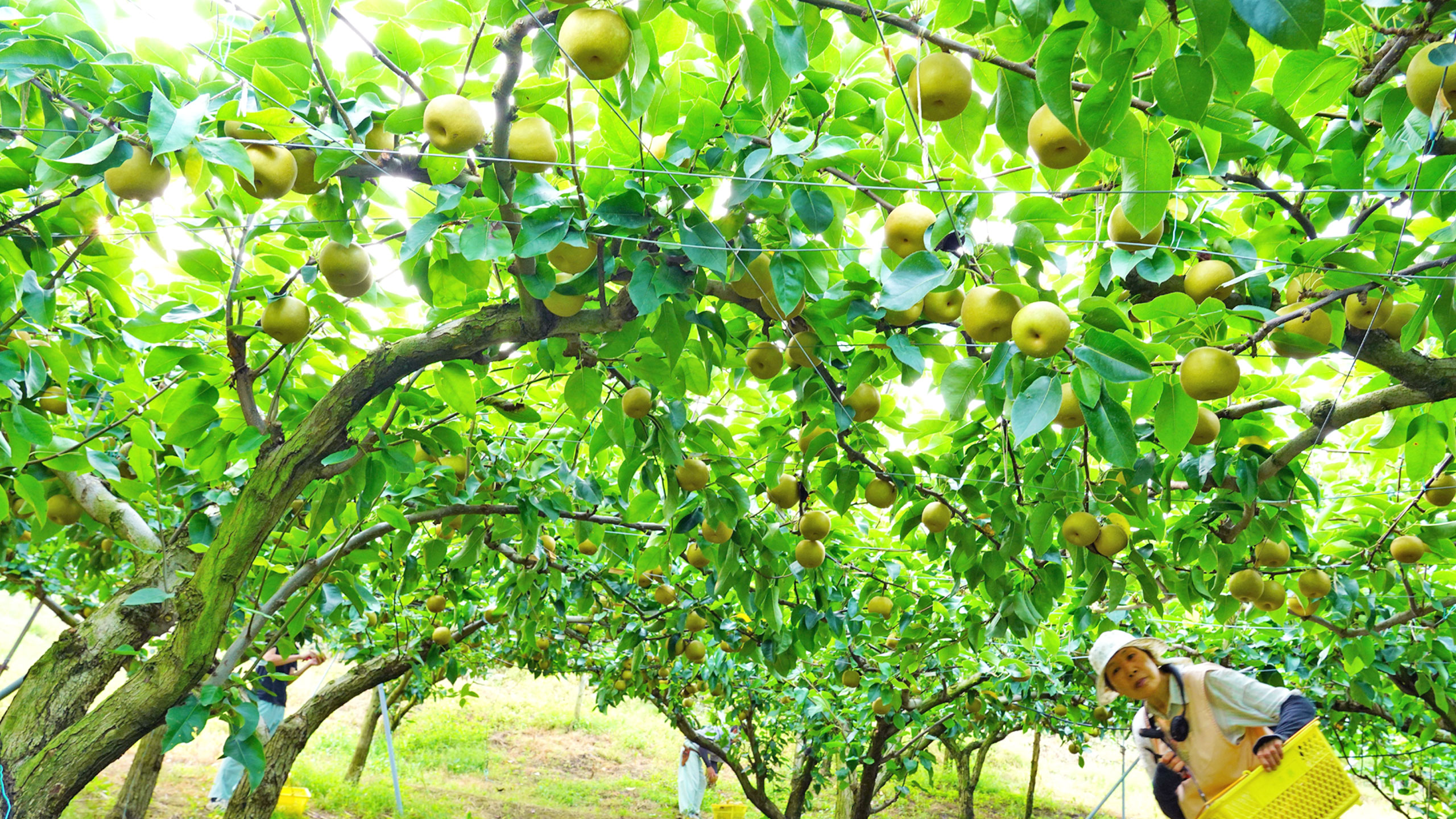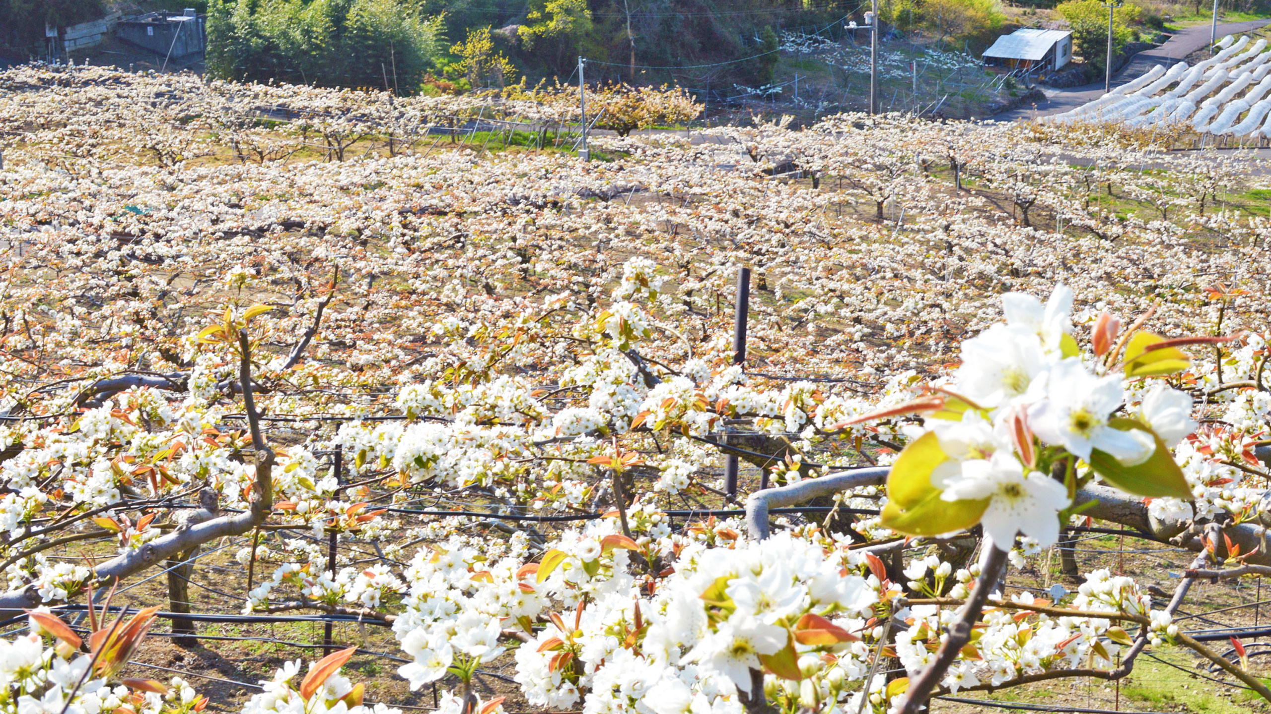 豊浜町は県下一の梨の産地です。例年4月中旬頃になると真っ白い梨の花が、丘一面に白い絨毯のように埋め尽くされる姿は美しく春の訪れを感じさせてくれます。また、ホウナンの梨は8月中頃に旬を迎えしゃっきりとした歯ざわりで、みずみずしく、糖度が高いので年齢を問わず人気なので、是非一度ご賞味ください。