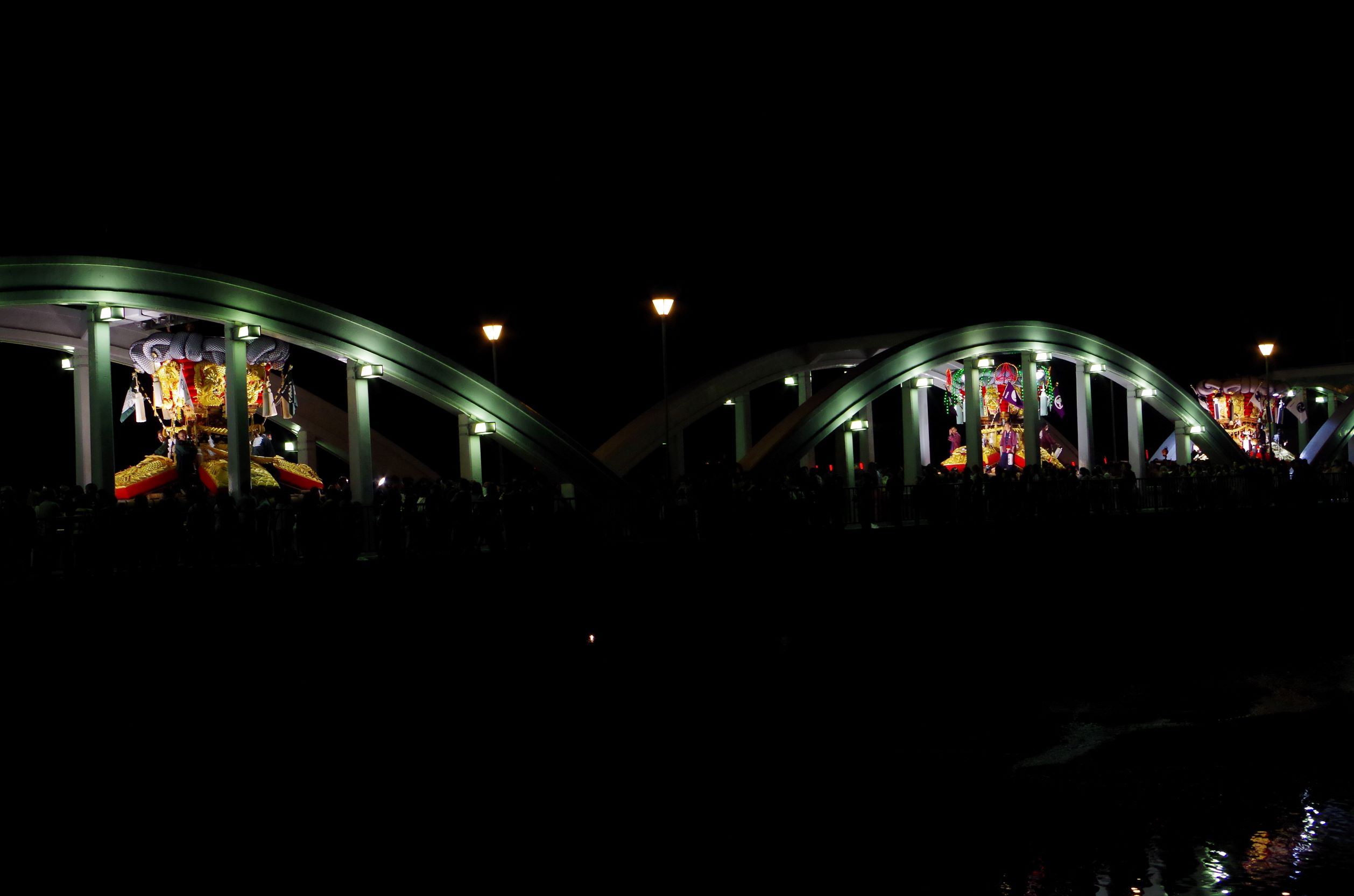 三架橋(さんかばし)は、3つのアーチが美しく「日本百名橋」に選ばれている市内で最も美しい橋です。長さ93m、幅員6mの鉄骨コンクリート下路式タイドアーチ橋で、観音寺市内から有明浜や名勝琴弾公園に行く途中にあります。秋に行われる琴弾八幡宮大祭に9台のちょうさが三架橋を渡っていく様子は観音寺の風物詩であり、特に夜のライトアップの中渡る姿は圧巻です。