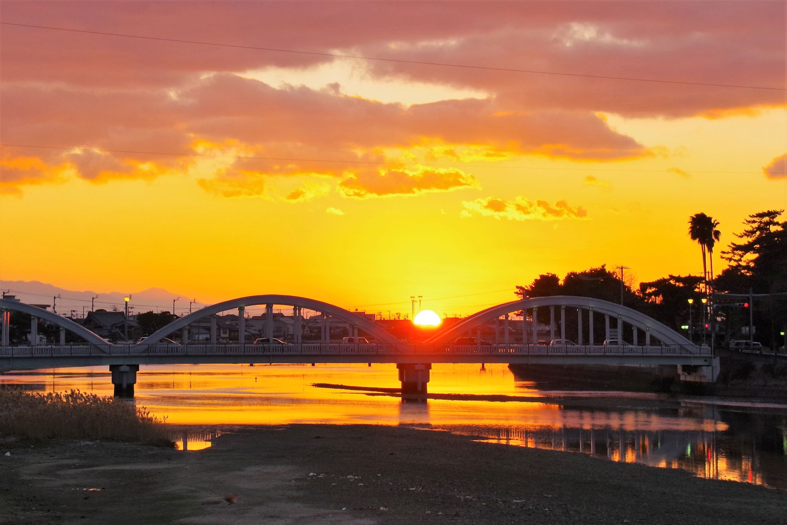 三架橋の歴史は古く、文政12年(1829年)にはこの橋が存在していたことがわかっています。江戸時代の頃は今の姿とは違い三連の太鼓橋で、当時は丸木の寄せ造りで橋を渡って琴弾八幡宮に「参賀」するということで「参賀橋」と呼ばれていました。明治18年には平面の木橋に改められ、1935年(昭和10年)に現在の橋に替えられています。また、「日本百名橋」にも選ばれており、朝、昼、夕方、夜となど三架橋は様々な顔を見せてくれます。