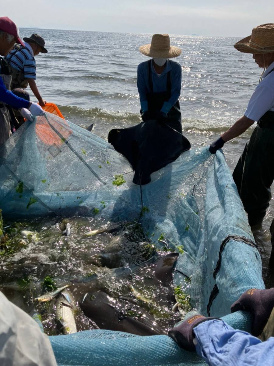 毎年1回、5〜9月の間に大野原にある花稲海岸で行われている体験型イベントです。花稲地区地曳網実行委員会が昔ながらの伝統漁法に触れて海や魚に親しんでもらおうと、1994年から毎年開催されている取り組みです。沖合に仕掛けられた約300メートルの網を参加者みんなで力を合わせて引き寄せ、瀬戸内の海の恵みを収穫します。無料で参加でき、たくさん魚が獲れた場合はみんなで山分けして持って帰る事ができます。