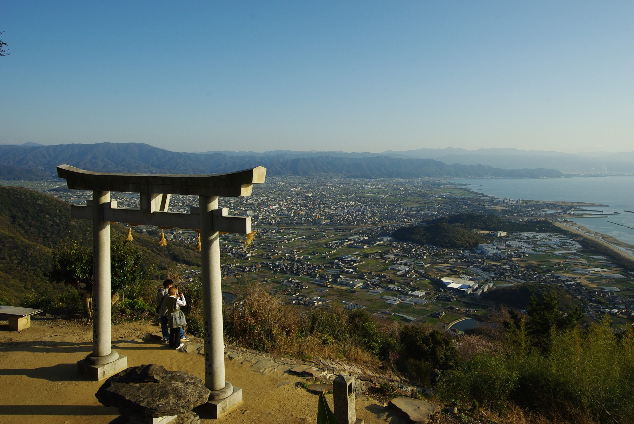 高屋神社(たかやじんじゃ)は、讃岐国延喜式内24社の1社です。当初、稲積山頂にあった本殿を山麓に移しましたが、後に山頂に再び造営しました。山の名前から、稲積神社(稲積さん)とも呼ばれており、稲の神さんとして古くから親しまれています。標高404mの山頂からは観音寺市が一望でき、眼下には広大な燧灘(ひうちなだ)の瀬戸内海と有明浜が広がっています。天気が良ければ石鎚山までを望むことができる絶好のビュースポットです。里宮である下宮から本殿までは、最後に270段の急な幅広い石段があり、その中段にはゆるぎ石とよばれ指で押しても動くが落ちない岩がどっしりと座っています。