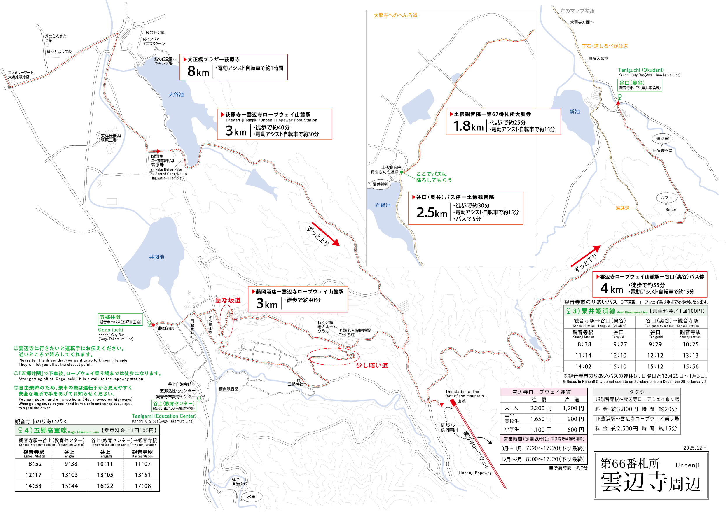 | のりあいバス | JR観音寺駅からのりあいバス五郷高室線に乗り、運転手に「雲辺寺ロープウェイに行きたい」と告げてください。谷上(教育センター)バス停先で下車し、案内標識に従ってください。 |