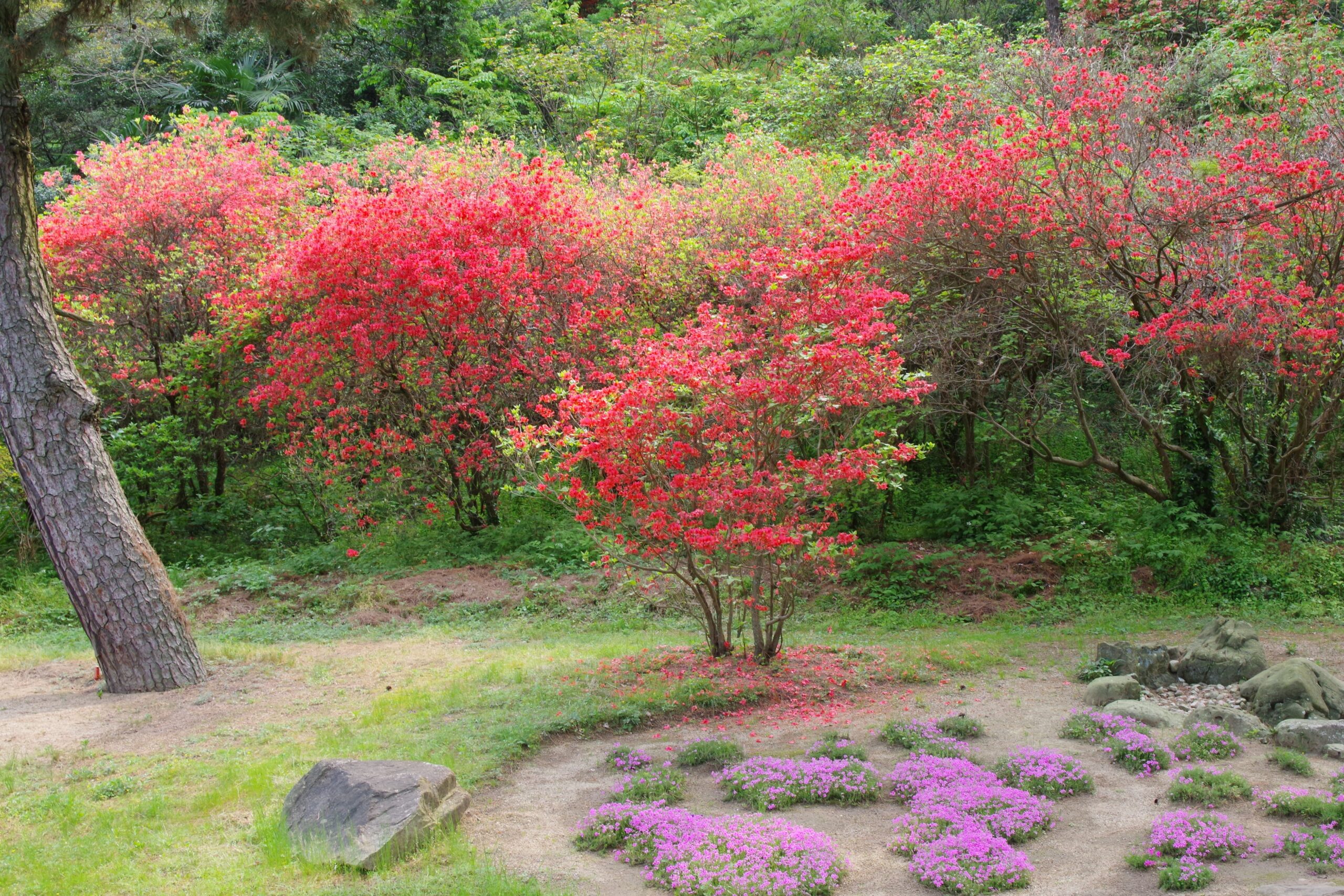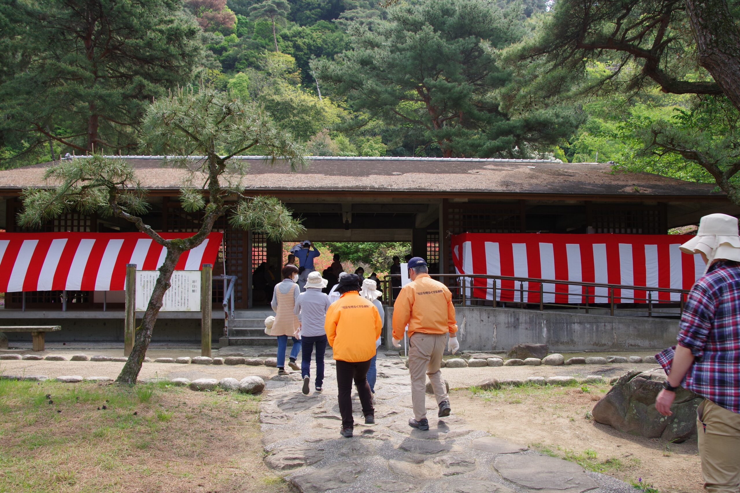 毎年、琴弾公園の恒例行事となっている銭形砂絵「寛永通宝」の春の砂ざらえ(化粧直し)に合わせて、若葉茶会を観光協会主催で開催しています。裏庭には水琴窟があり、琴に似た金属的で独特な反響音が楽しめます。 新緑の松やもみじに囲まれて、水琴窟と満開の山ツツジを借景にお抹茶を楽しみませんか。