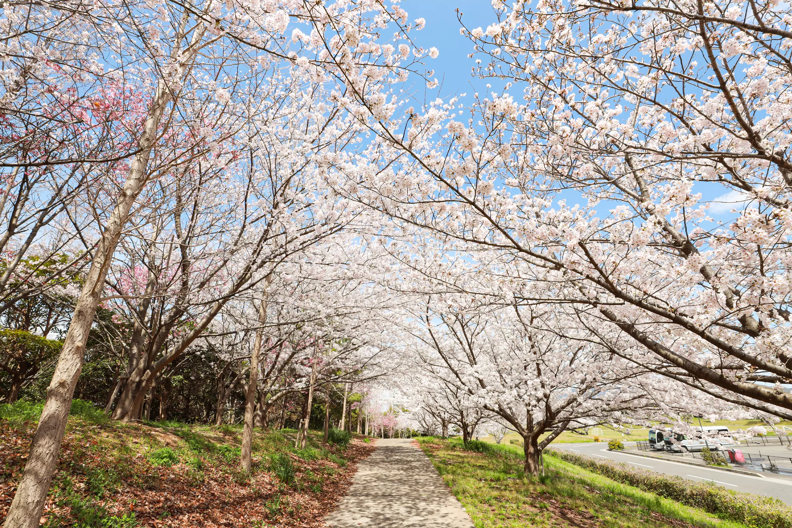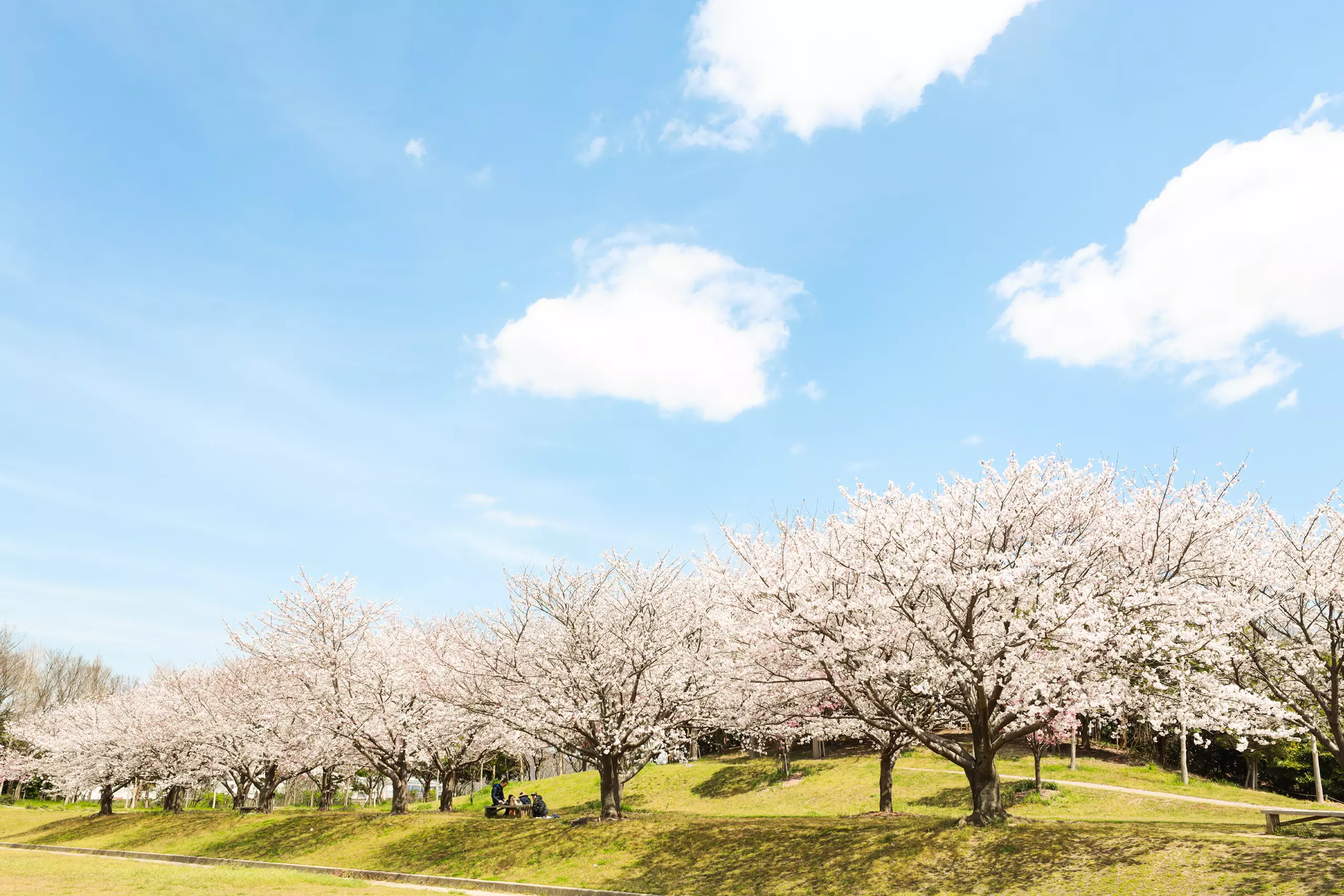 山田ふれあい緑地は、陽光桜やソメイヨシノなどが植樹されており季節を通して楽しめる公園です。地元スポーツ少年サッカーが管理使用しているグラウンドの周りに小高い山もあり、散歩コースとしても多くの人に利用されています。アスファルト駐車場と水洗トイレも近くにあるので、お花見や子連れでのピクニックにもおすすめです。